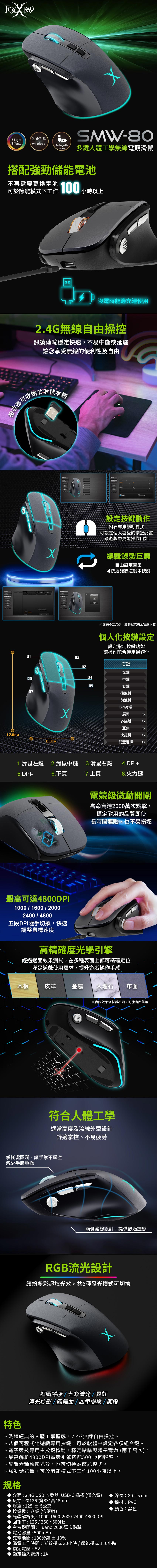 FOXXRAY 狐鐳 多鍵人體工學無線電競滑鼠-充電式(FXR-SMW-80)