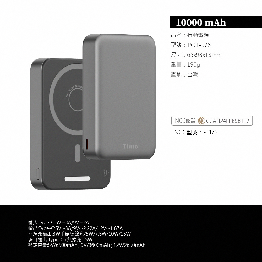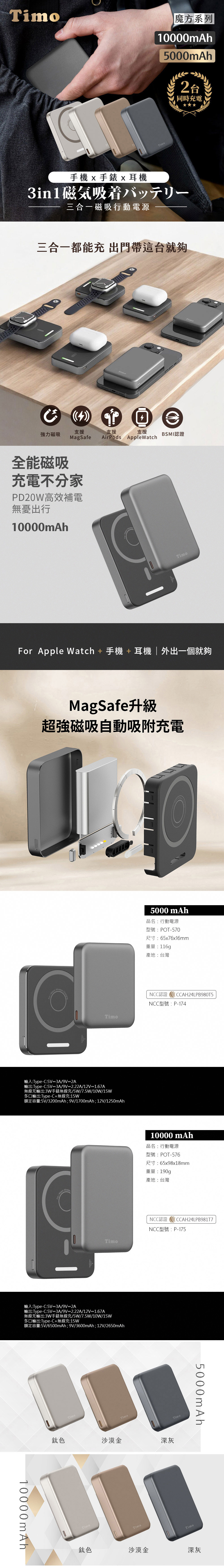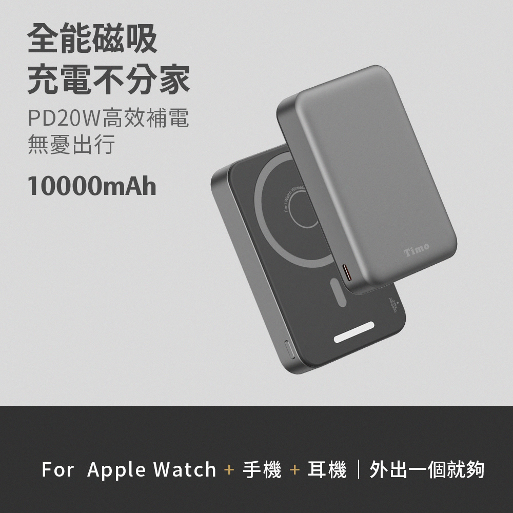 【Timo】魔方系列 PD快充 三合一磁吸無線充行動電源10000mAh-鈦色