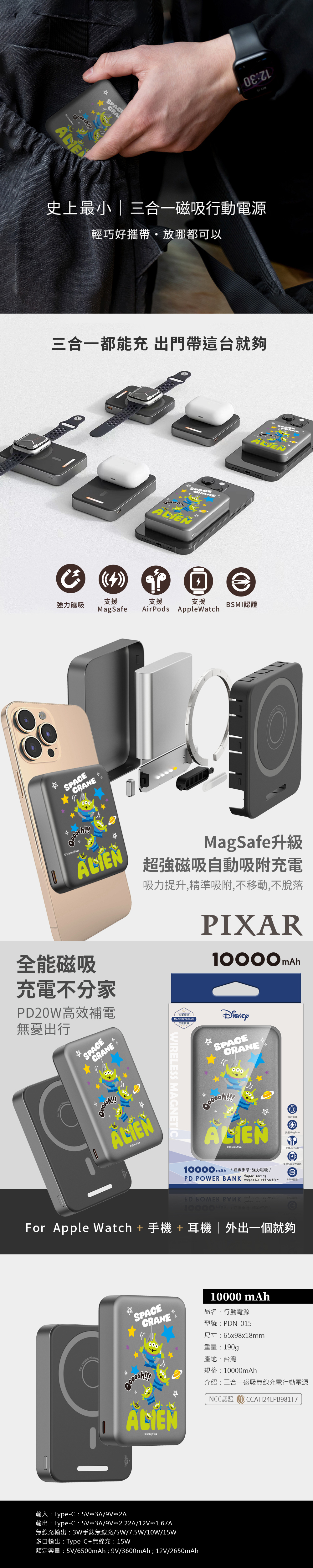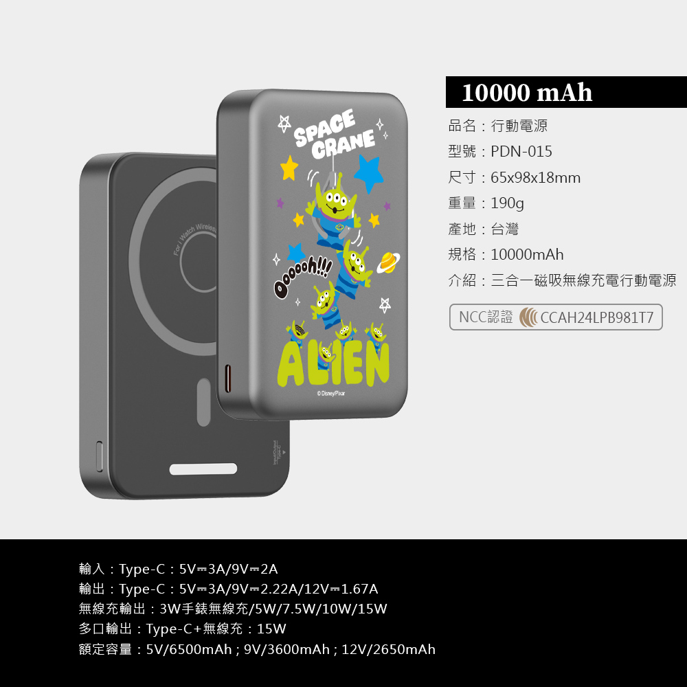 【Disney迪士尼】魔方系列 PD快充 三合一磁吸無線充行動電源10000mAh-一串三眼怪