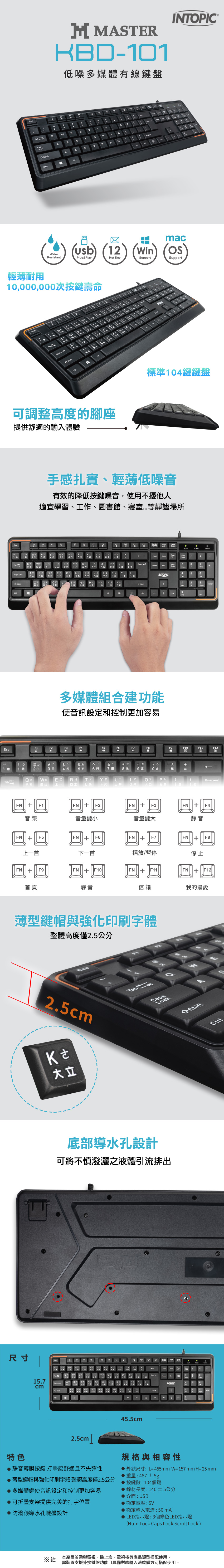 INTOPIC 低噪多媒體有線鍵盤(KBD-101)