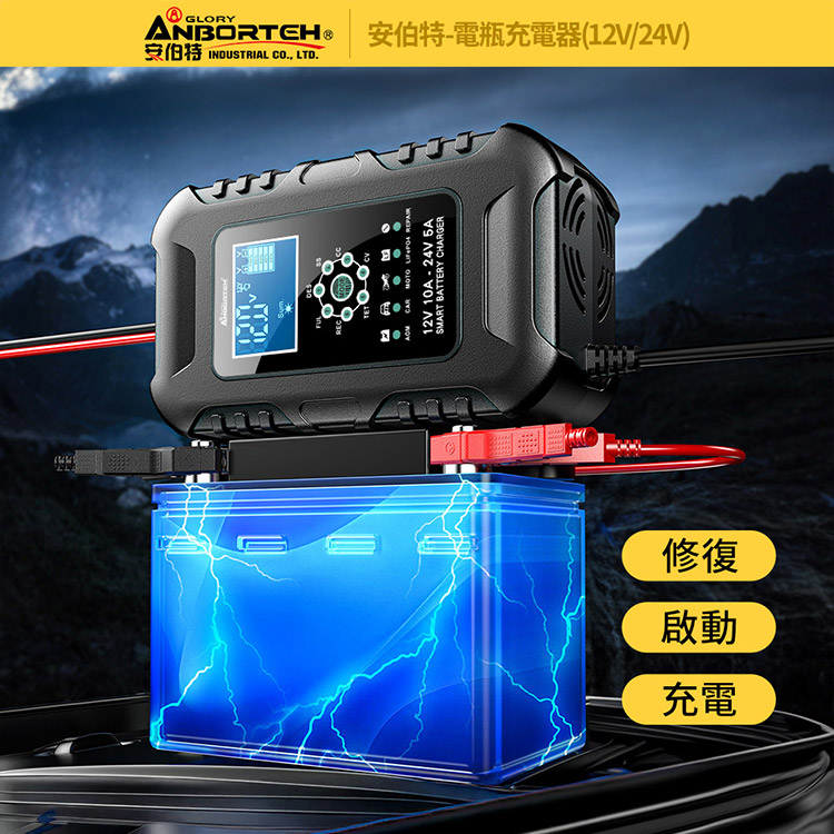 【安伯特】電瓶充電器(12V/24V)黑色款(一年保固) 汽車/機車/貨車/電瓶修復