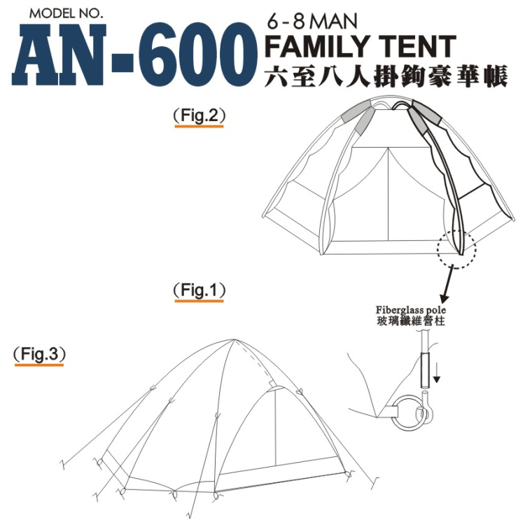 • 使用超粗9.5m/m玻璃纖維營柱,附營繩、營釘,堅固耐用。