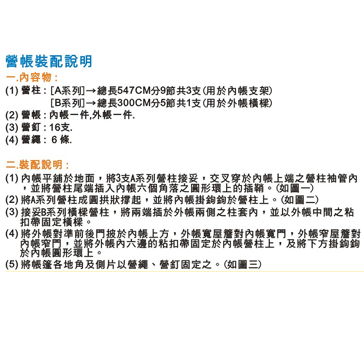 • [B系列]→總長300公分(分5節)共1支(用於外帳橫樑)