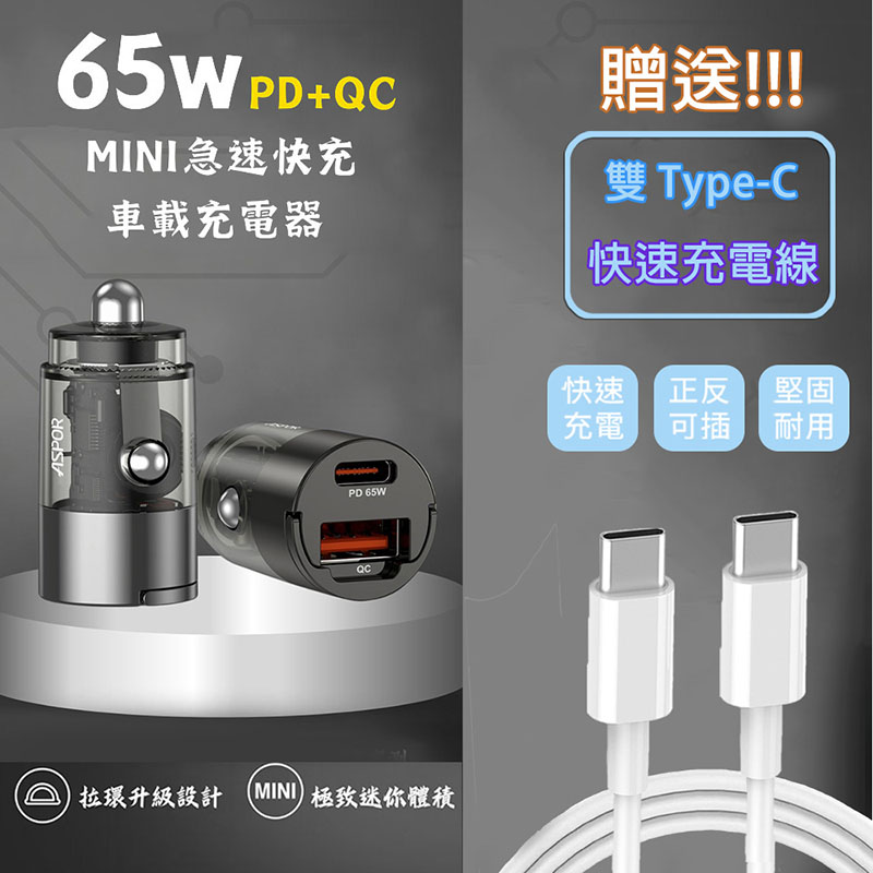ASPOR 急速65W Mini快充PD+QC車載充電器(附贈Type-C充電線)