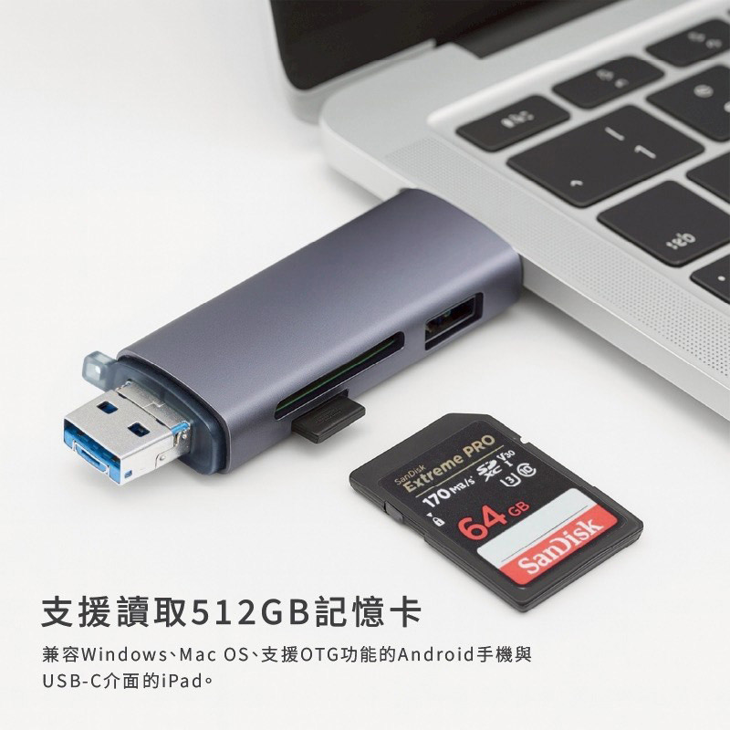 USB3.0 六合一 OTG讀卡,支援最大512GB的SD與TF卡,
