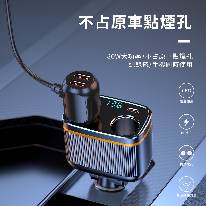 ◎ 80W點菸孔+45W PD充電+20W USB充電|4孔同步輸出,滿足多設備需求