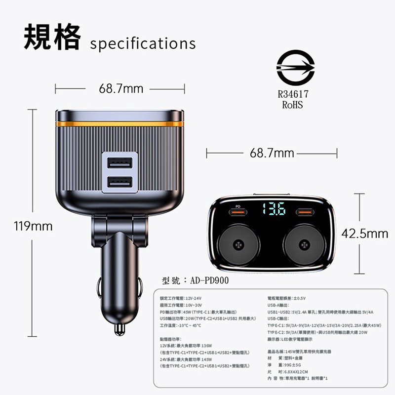 Songwin 145W雙孔車用擴充器/車用充電器(PD45W+QC3.0/數顯電壓/90度可彎折)