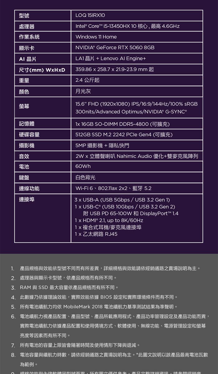 《Lenovo 聯想》LOQ 83JE00PATW(15.6吋FHD/i5-13450HX/16G+16G/512G+512G/RTX5060/特仕版)