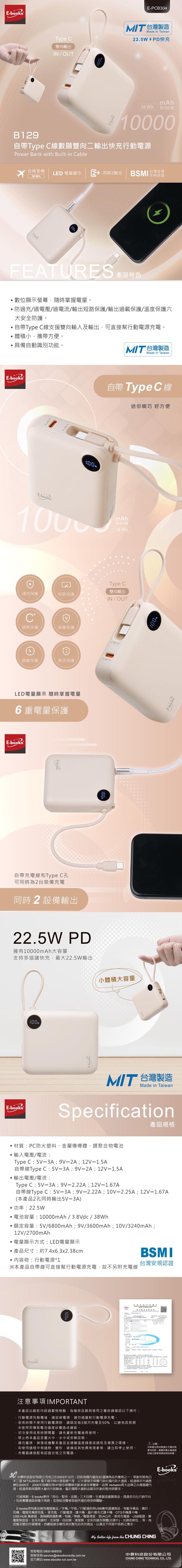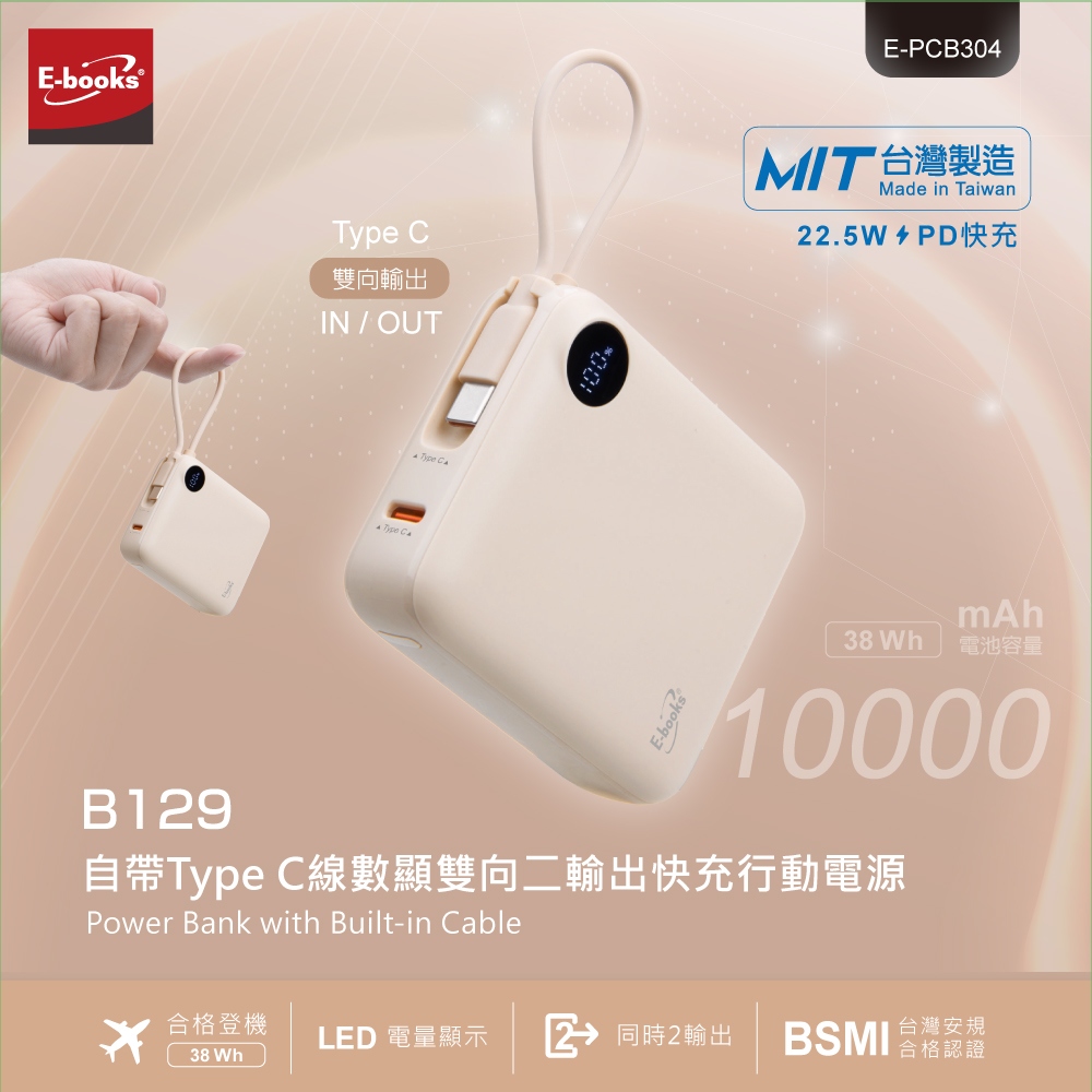 E-books B129 【台灣製造】自帶Type C線數顯雙向二輸出快充行動電源