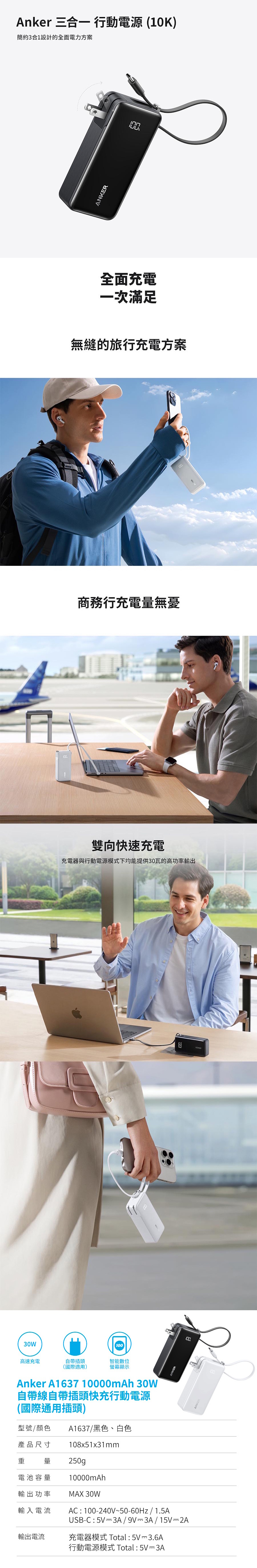 Anker A1637 10000mAh 30W 自帶線自帶插頭快充行動電源(國際通用插頭) 黑