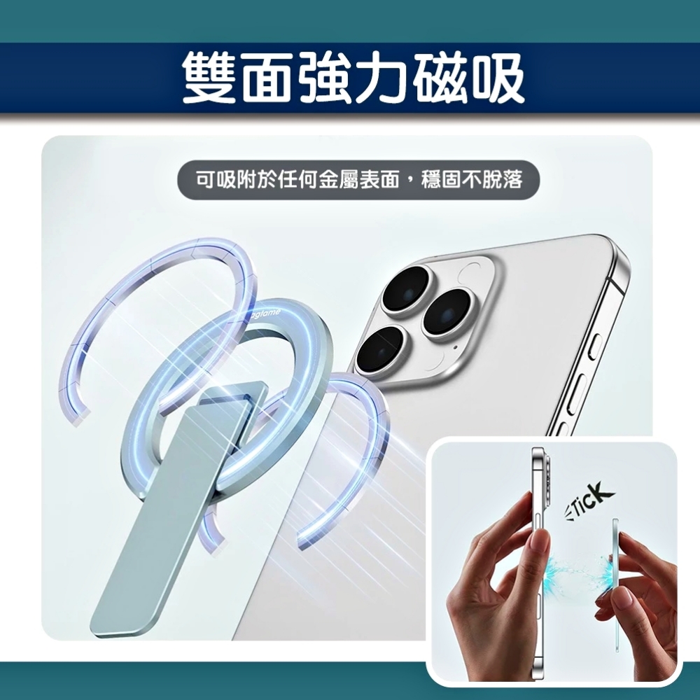 強磁吸:強大的磁鐵和人體工學設計可穩穩固定手機,確保不會滑落。