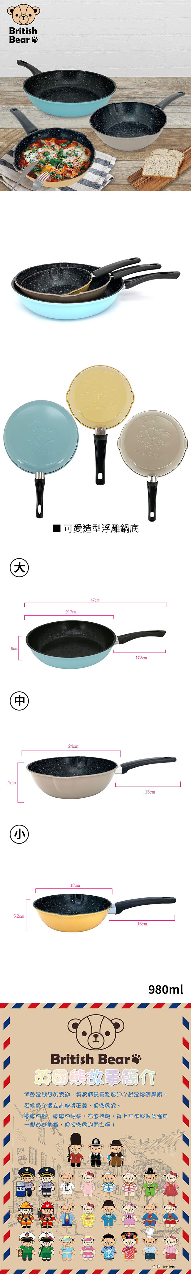 ■ 英國熊授權圖案商品 ■ 對應多種火源,使用便利 ■ 導熱性佳,節省料理時間 ■ 可愛造型浮雕鍋底 ■ 鍋身加高設計,煎炒多用 ■ 表面特殊處理,不易沾鍋 ■ 採用無毒材質,使用最安心