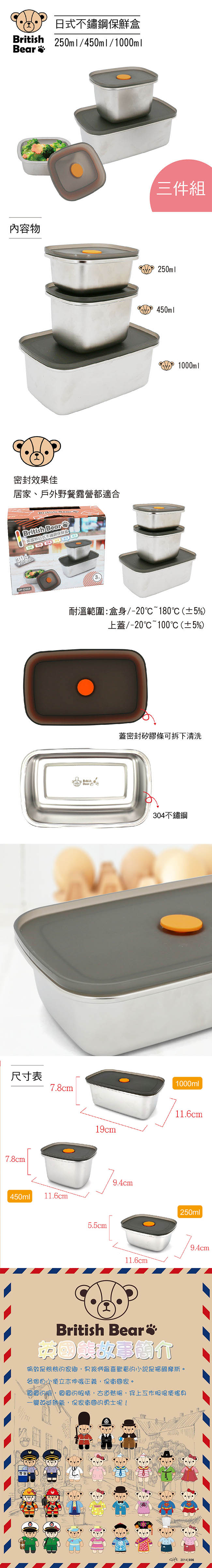 英國熊 日式304不鏽鋼保鮮盒三入組(250+450+1000ml) UP-D553