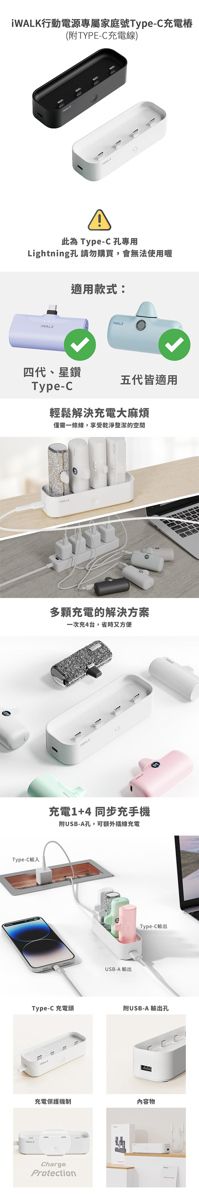 ■ 齊充四顆IWALK,只要一個裝置就能搞定 ■ 10W充電功率,約2小時可充飽電 ■ 可外接USB-A線,提供額外設備充電 ■ 外觀簡約設計,百搭居家配置 ■ 充電保護機制 ■ 附TYPE-C充電線 ※注意:此款式僅適用Type-C充電接口 ※如欲充iWALK TWINS雙頭直插式行動電源,需拔除保護套充電