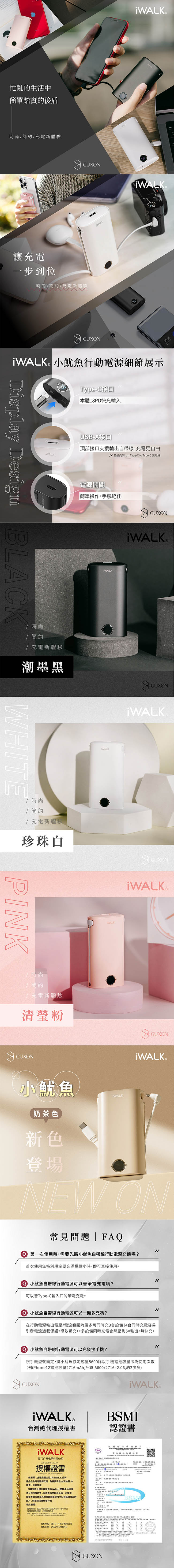 【iWALK】小魷魚自帶線PD快充行動電源9000mAh(附1M TYPE-C to C充電線) DBL10000S【珍珠白】