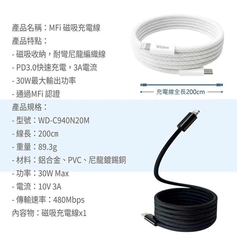 【Wildex】Type-C to Lightning 蘋果認證MFi/磁吸收納快充線/傳輸線/充電線(200公分)
