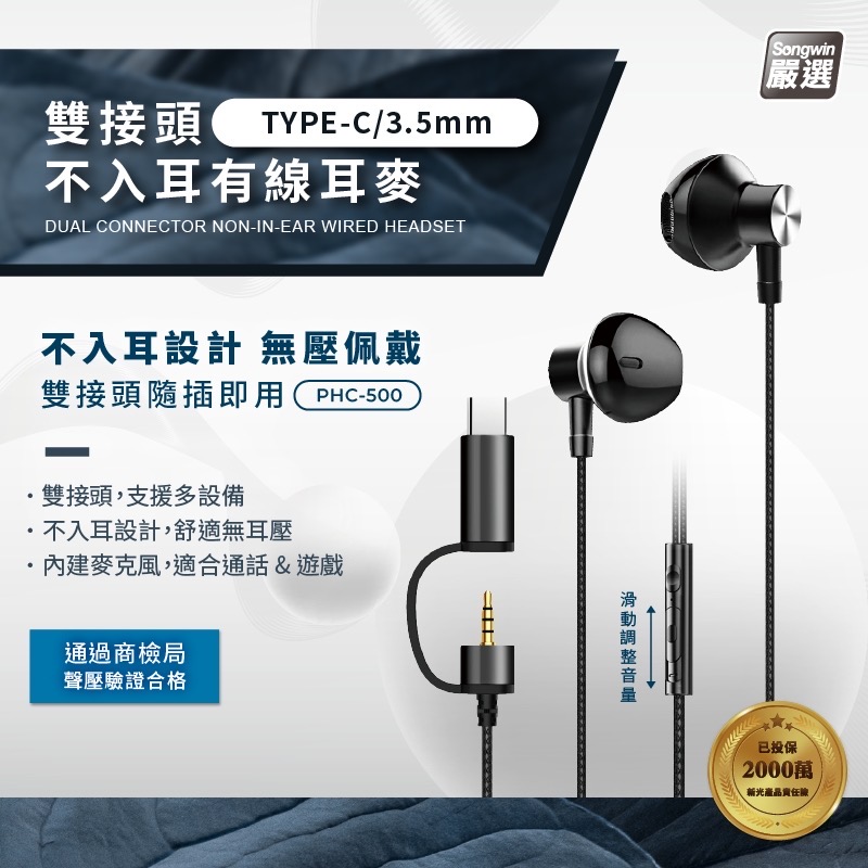【Songwin】雙接頭不入耳 立體聲耳機麥克風(TYPE-C/3.5mm)