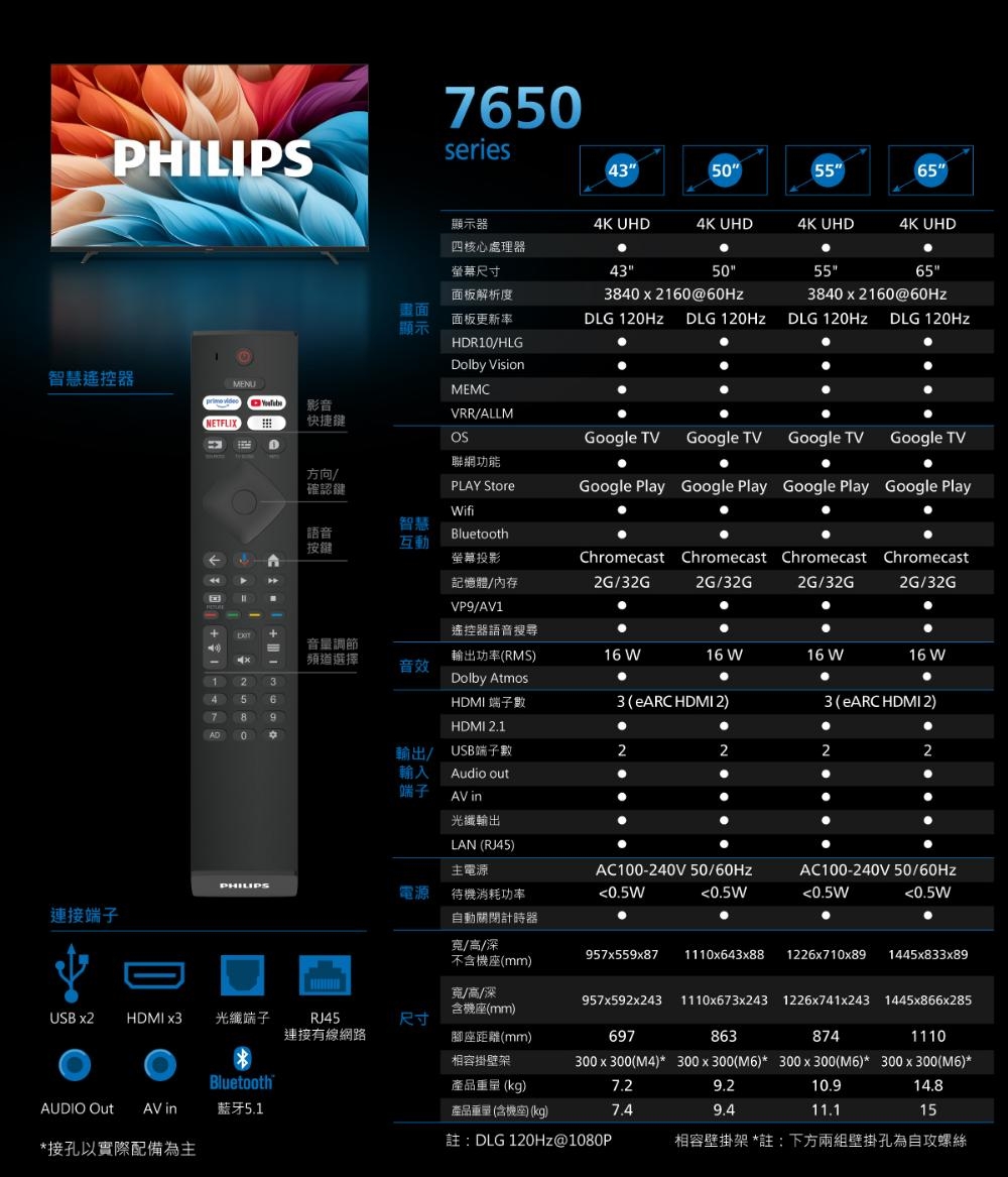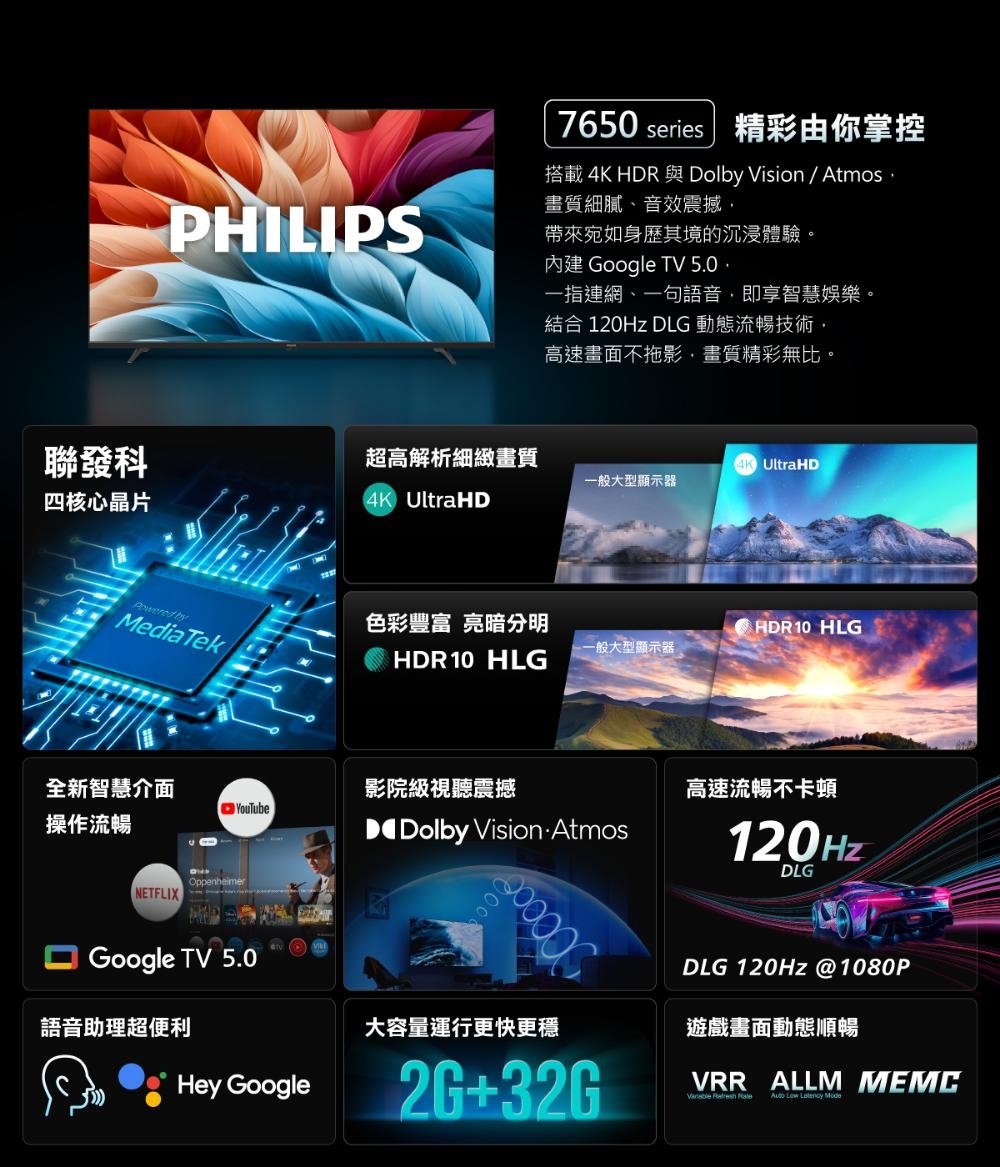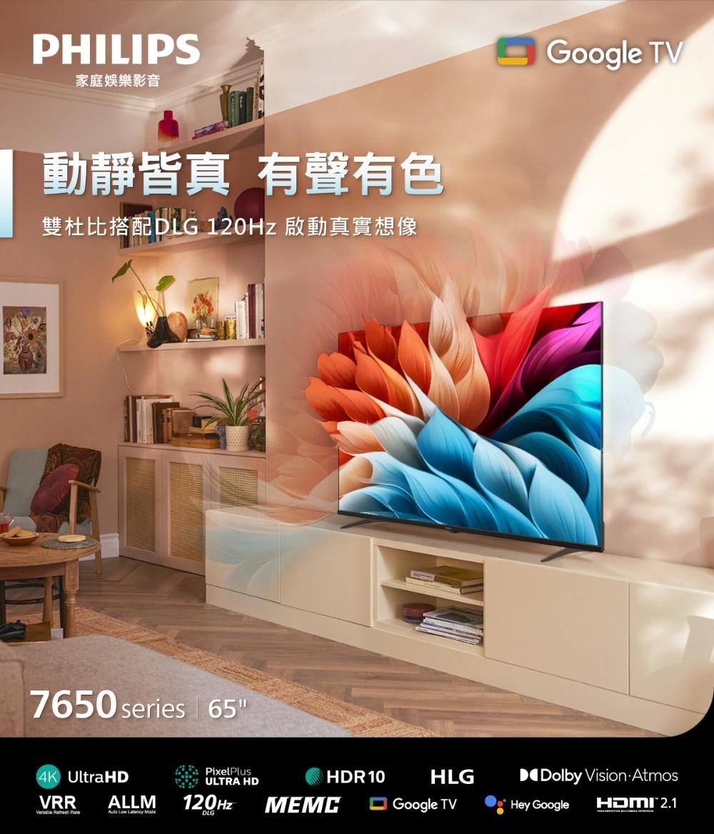 (送基本安裝)飛利浦 65吋4K DLG 120Hz GoogleTV液晶顯示器 65PUH7650