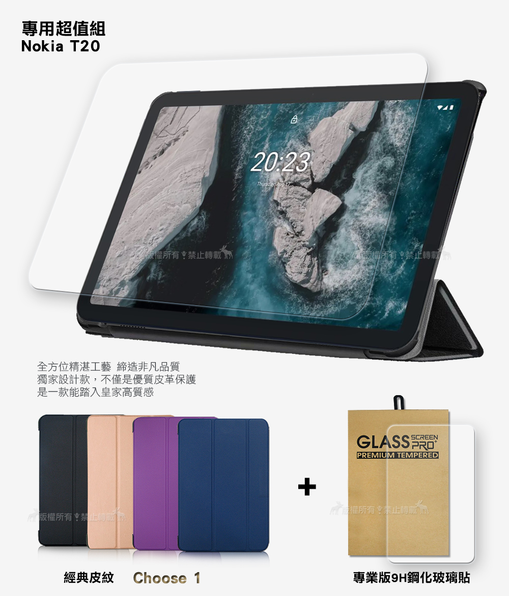 VXTRA Nokia T20 經典皮紋三折皮套+9H鋼化玻璃貼(合購價)