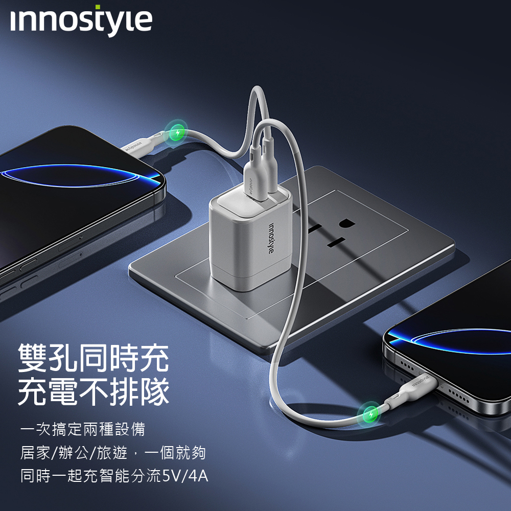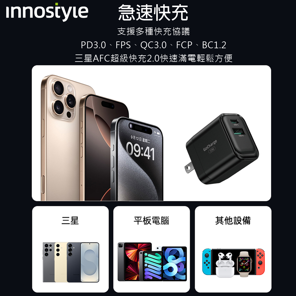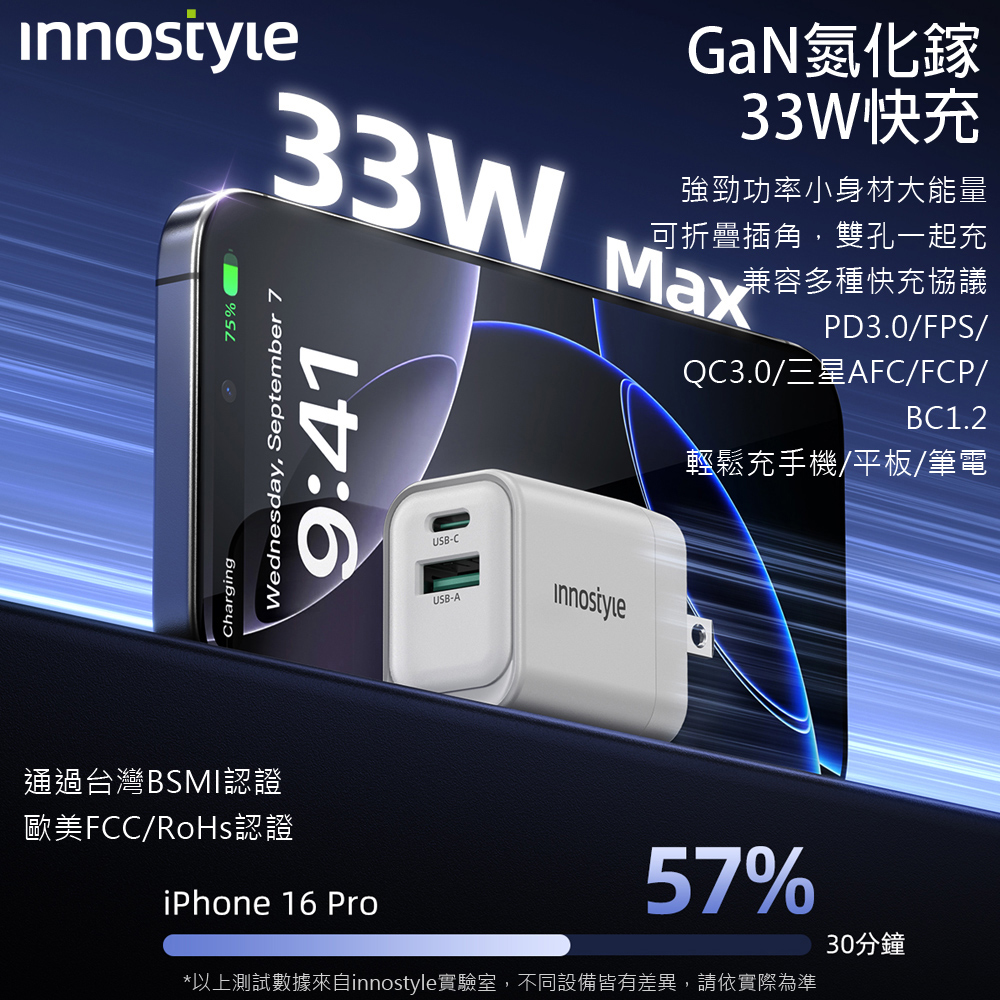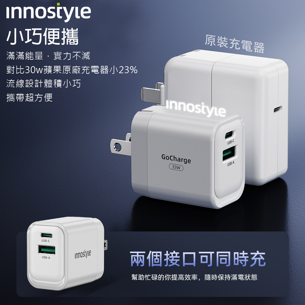 innostyle 雙孔 33W Type-C+USB PD/GaN氮化鎵快充充電器充電頭 GoCharge 黑色