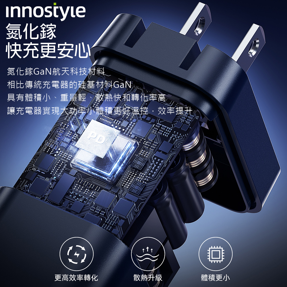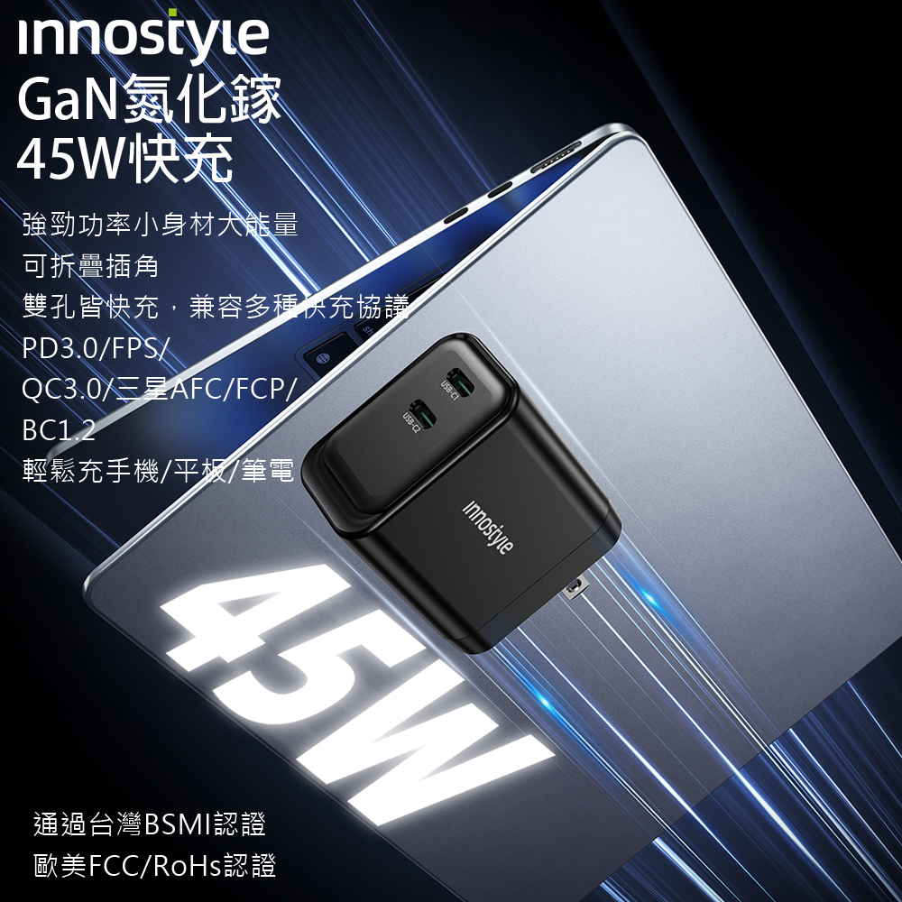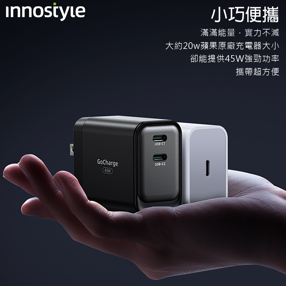 innostyle 雙孔 45W GaN氮化鎵 Type-C/PD快充充電器充電頭 GoCharge 黑色