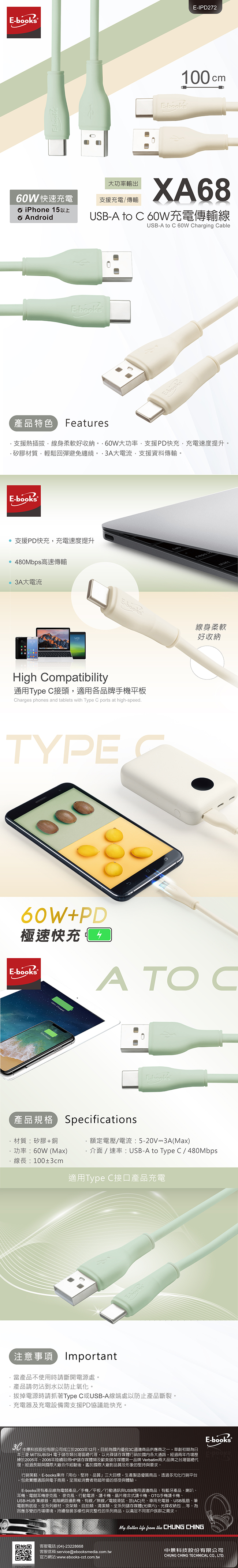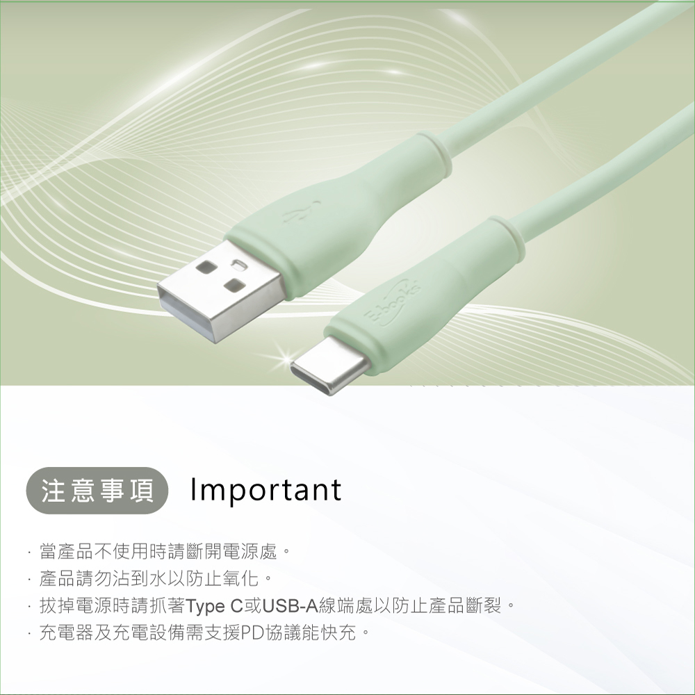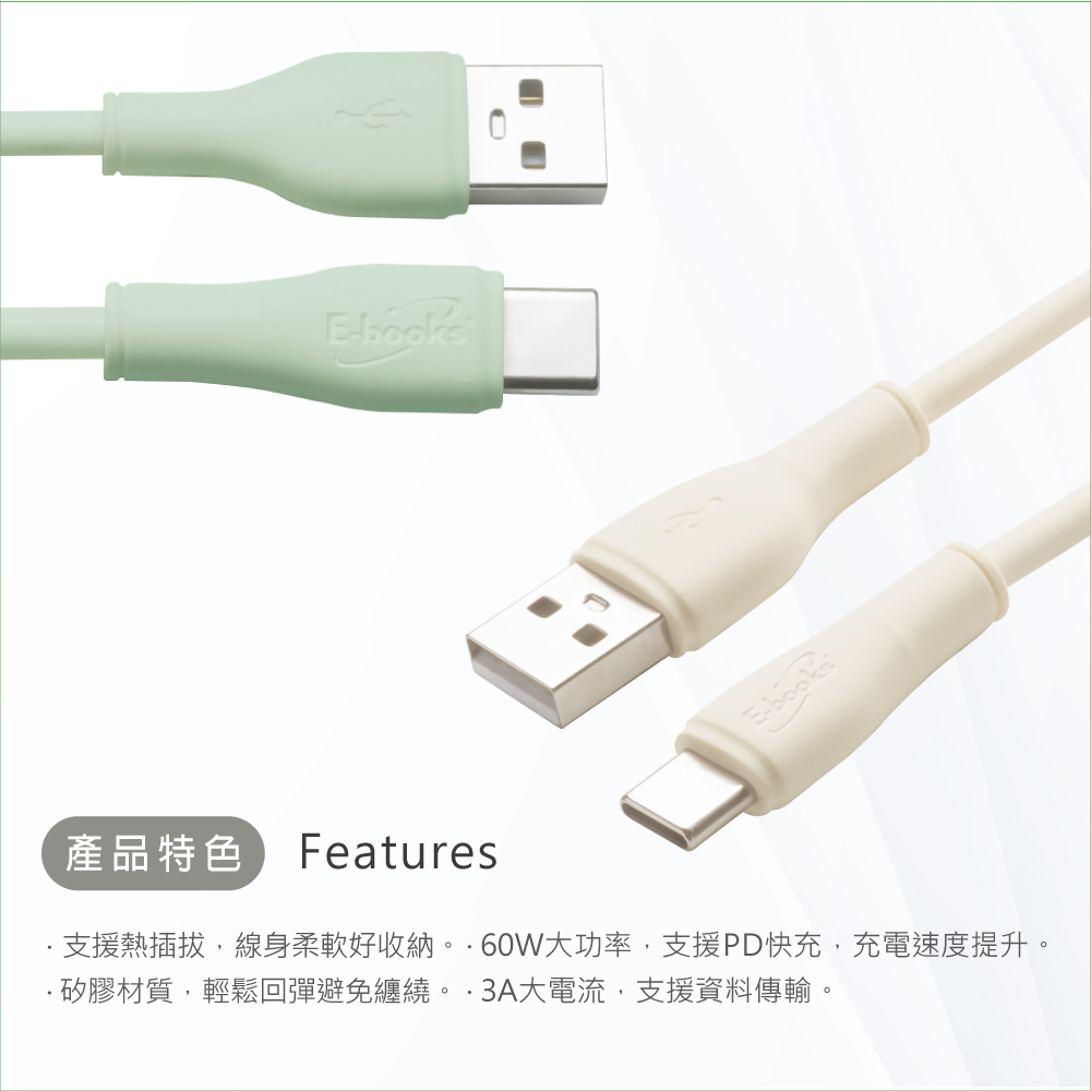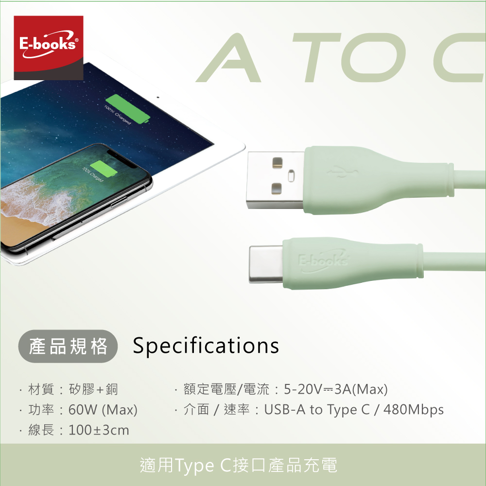 E-books XA68 USB-A to C 60W充電傳輸線-綠