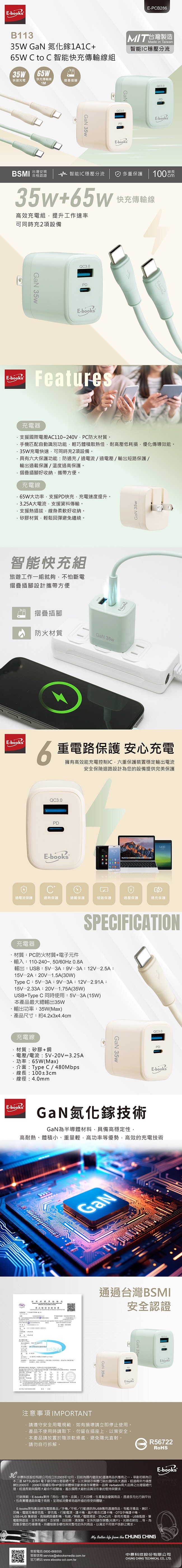 E-books B113【台灣製造】35W GaN 氮化鎵1A1C+65W C to C 智能快充傳輸線組-奶茶