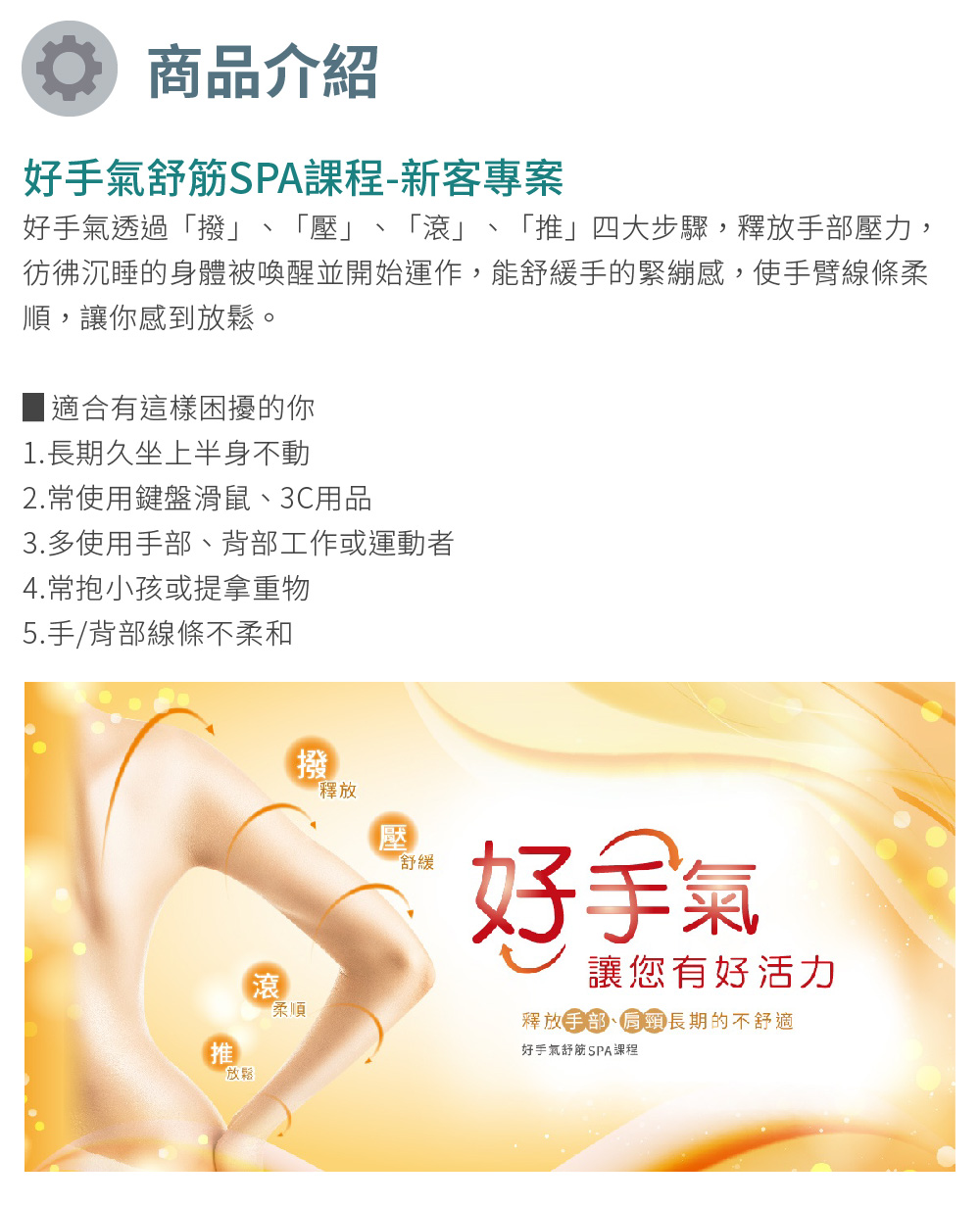 桃園【佐登妮絲】好手氣舒筋SPA課程-新客專案MO25