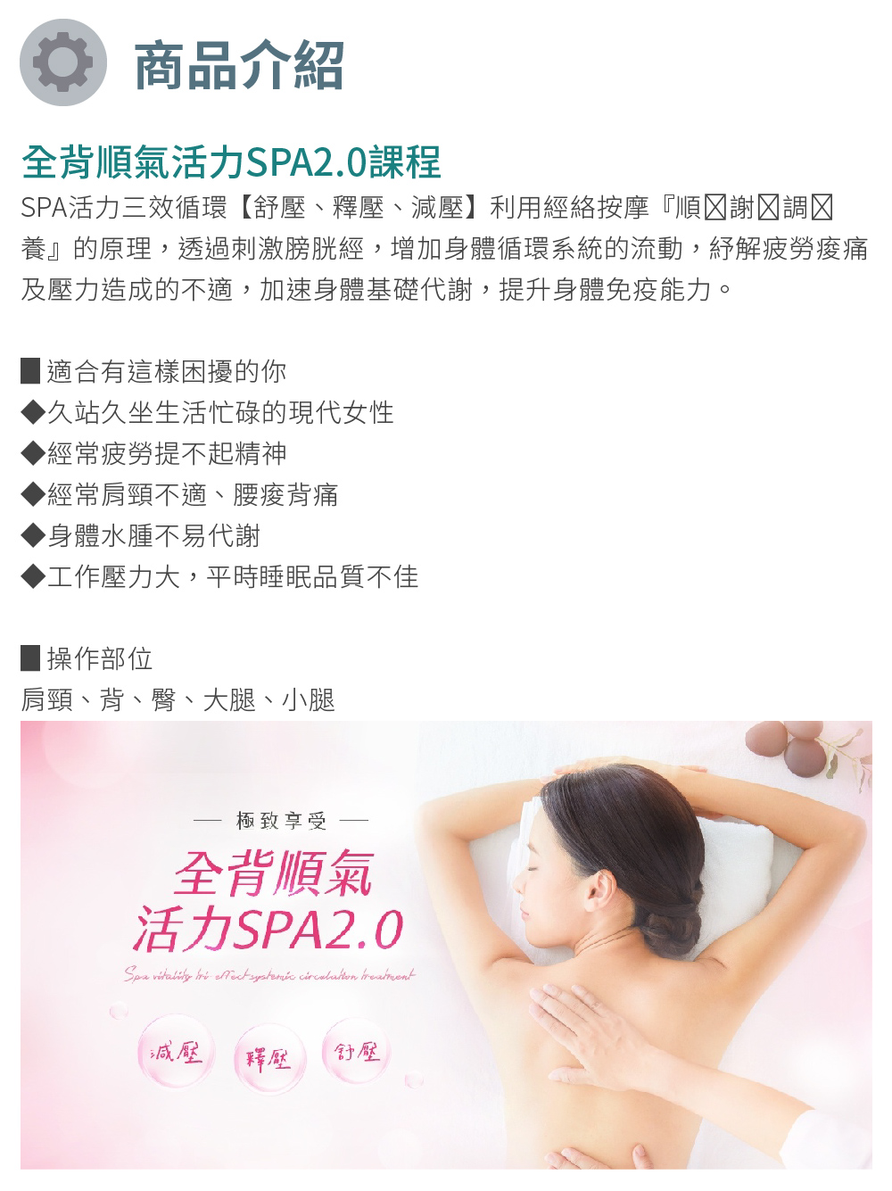 淡水【佐登妮絲】全背順氣活力SPA2.0課程/60分鐘-新客專案MO25
