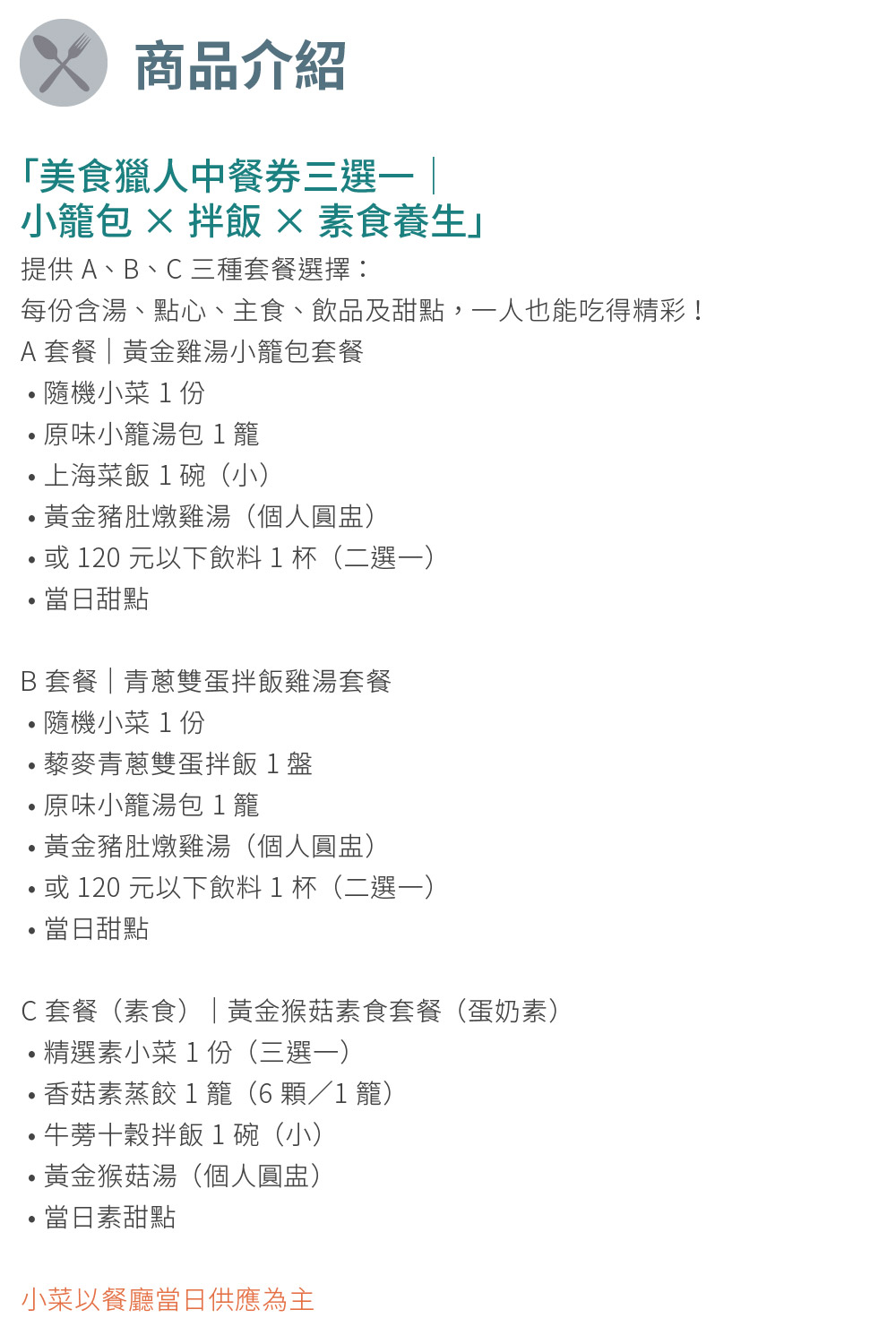 淡水【南北潮KITCHEN MASTER】(小籠包×拌飯×素食養生)美食獵人中餐券三選一_平假日適用(MO)