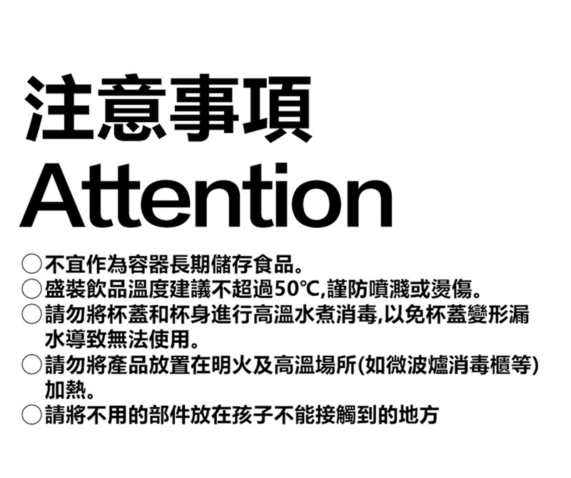 3.請勿將杯蓋和杯身進行高溫水煮消毒,以免杯蓋變形漏水導致無法使用。