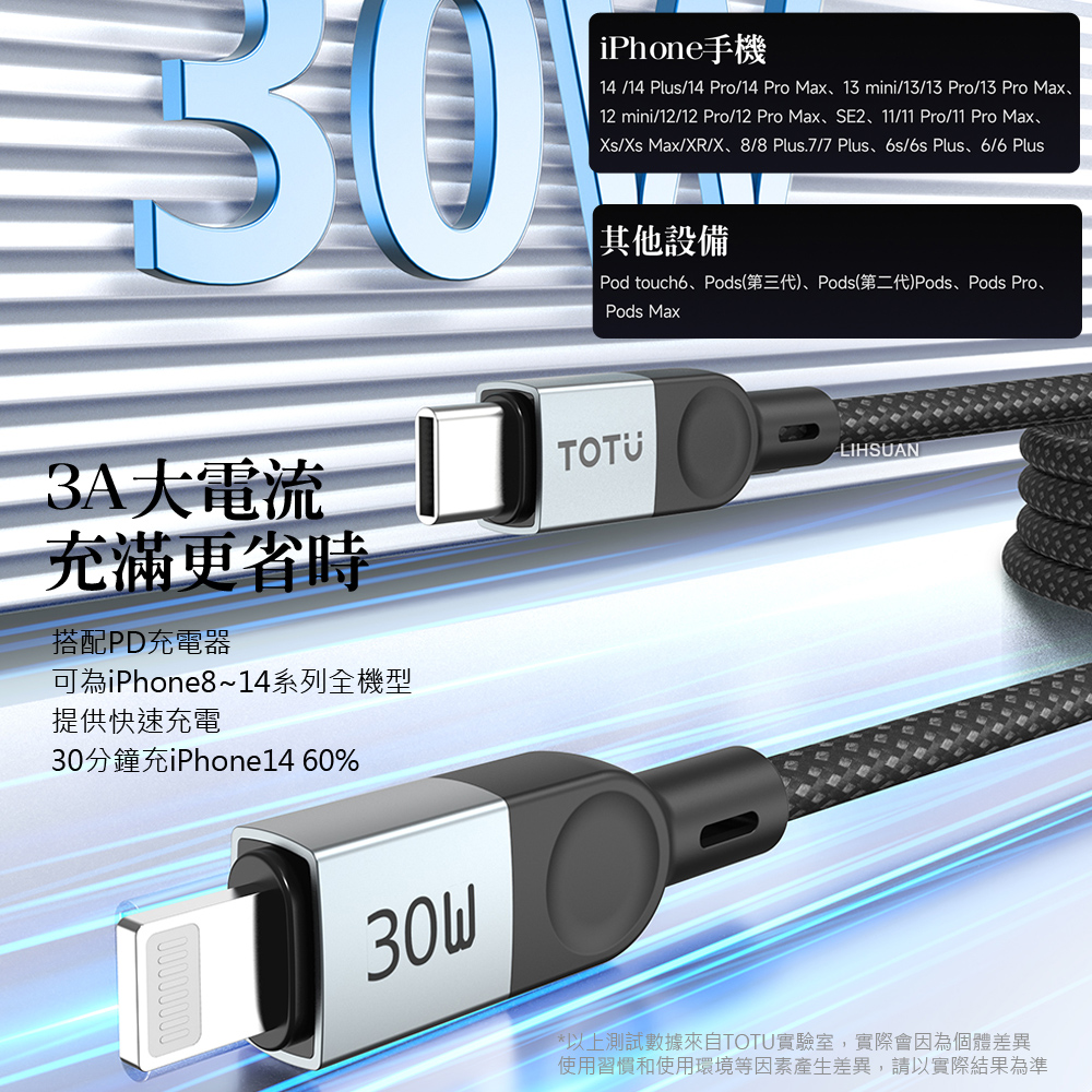 搭配PD充電器,可為iPhone8~14系列全機型,提供快速充電