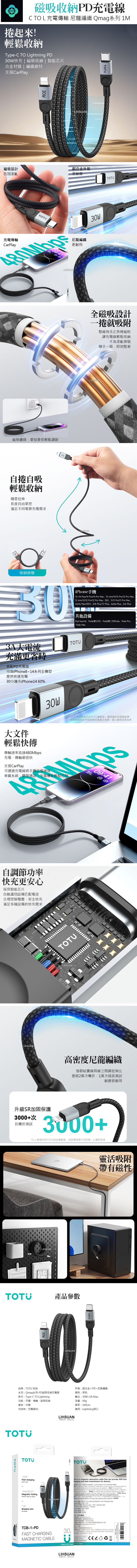 TOTU台灣官方 磁吸收納 Type-C TO Lightning PD 快充充電傳輸編織線 Qmag系列 1M