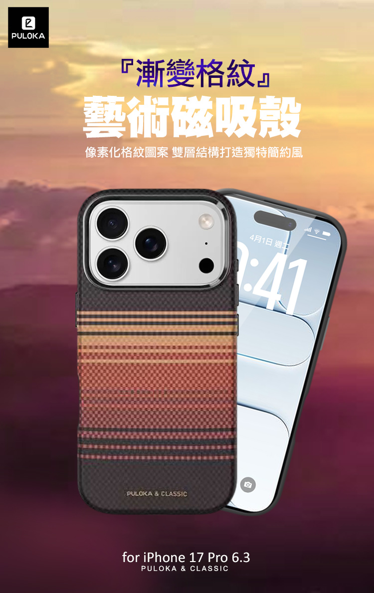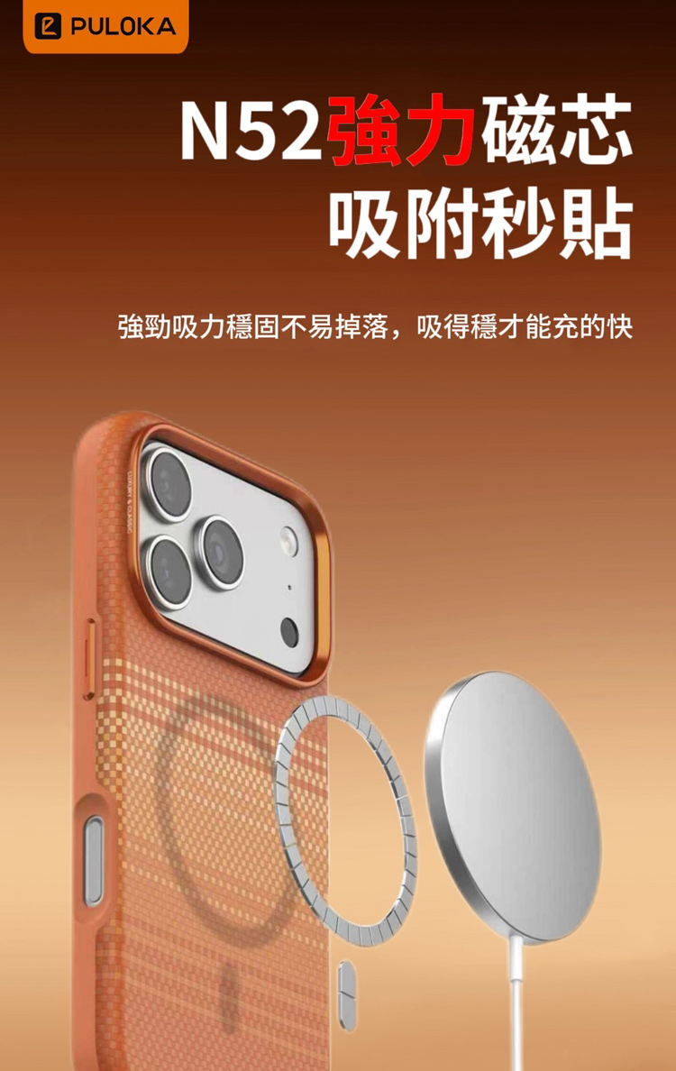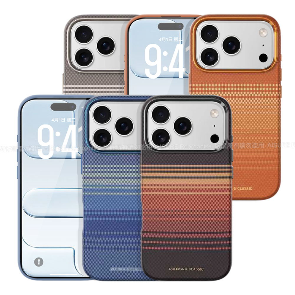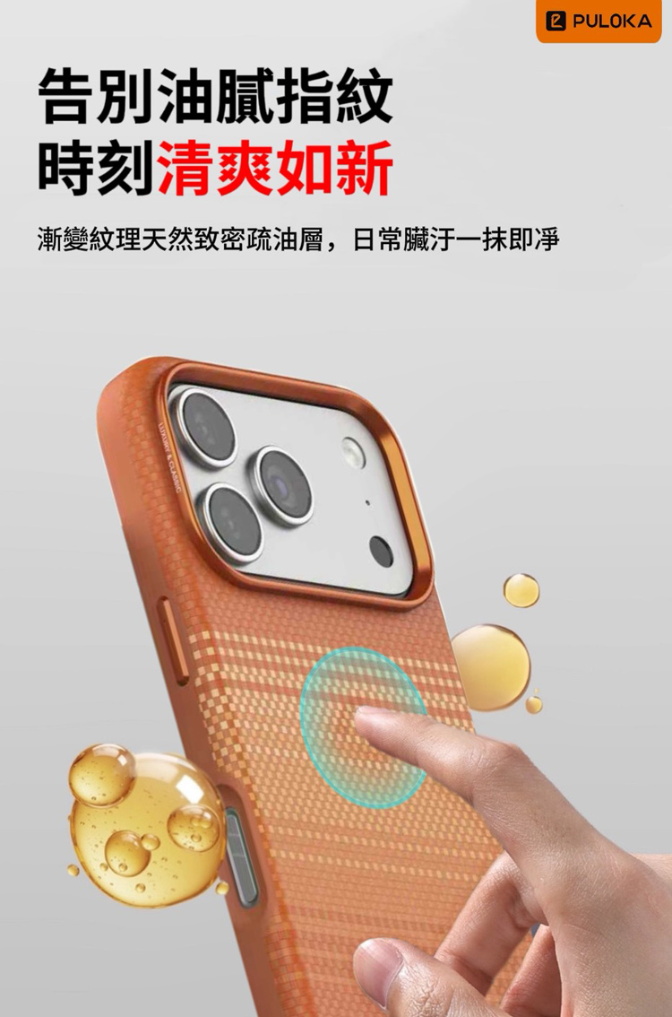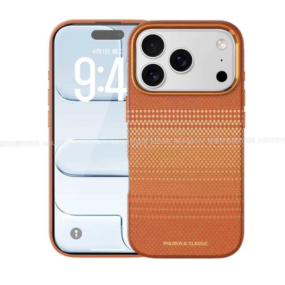 Puloka iPhone 17 Pro 6.3 凱夫拉藝術格紋磁吸鋁合金鏡頭框保護殼-橘