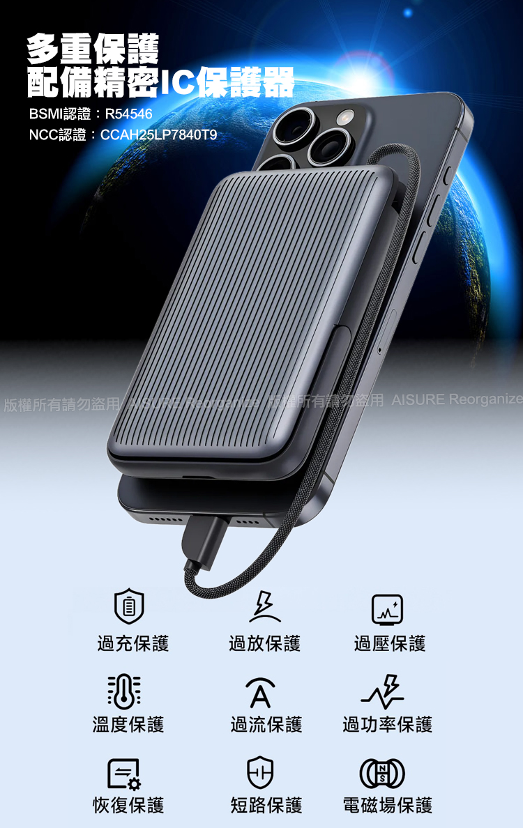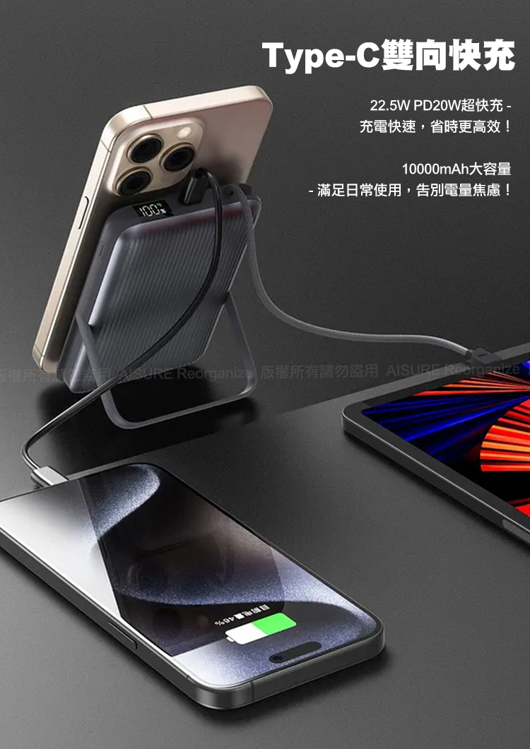 內建10000mAh大容量+22.5W PD快充,手機充電迅速又安全。