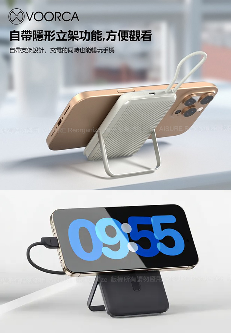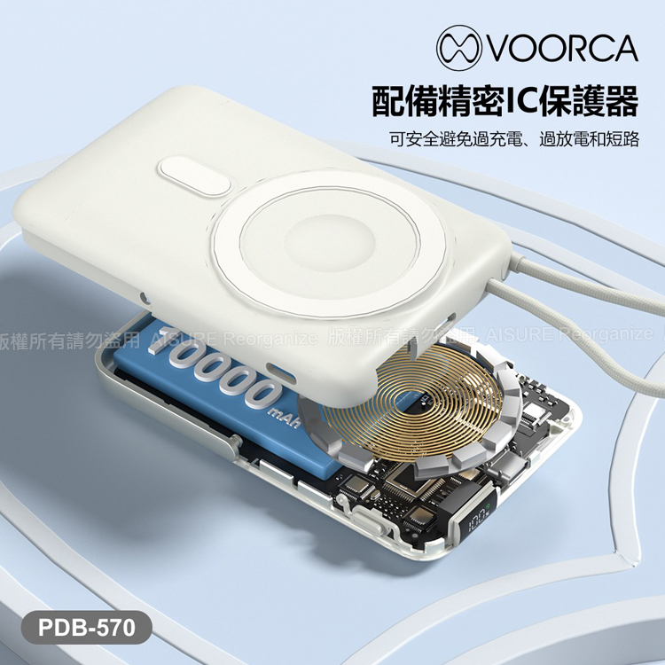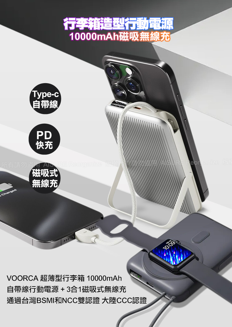 VOORCA PDB570 超薄行李箱10000mAh 自帶線+3合1磁吸無線充+立架功能 多功能快充-米白