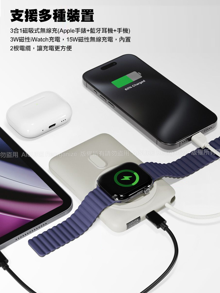支援3合1磁吸無線充(手機、手錶、藍牙耳機),多設備同時充電