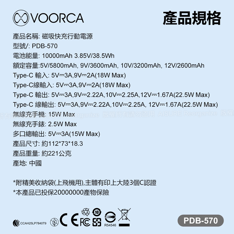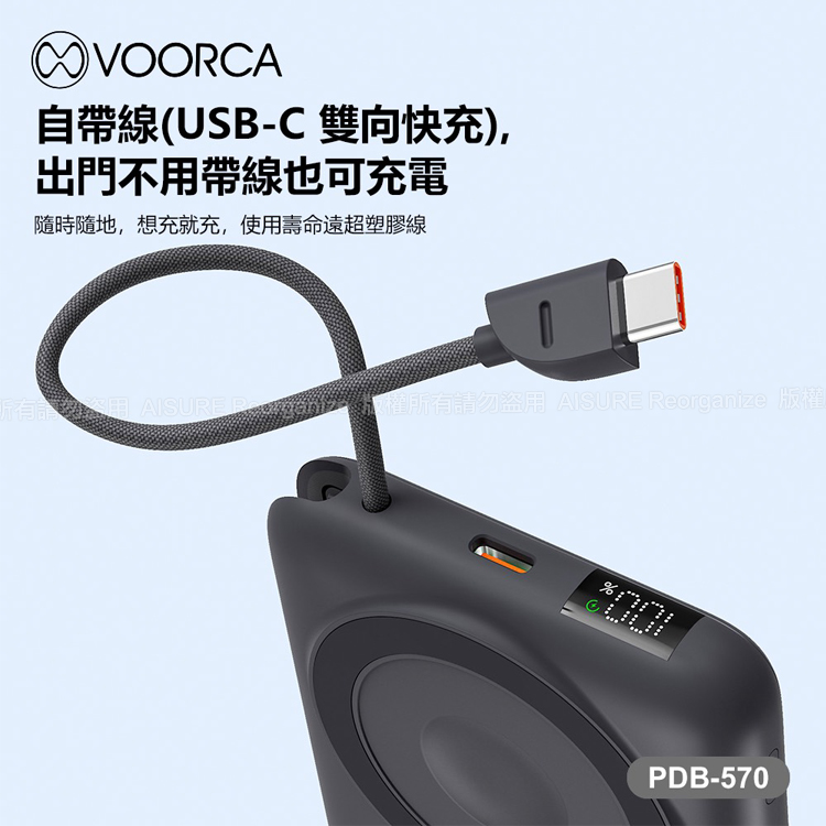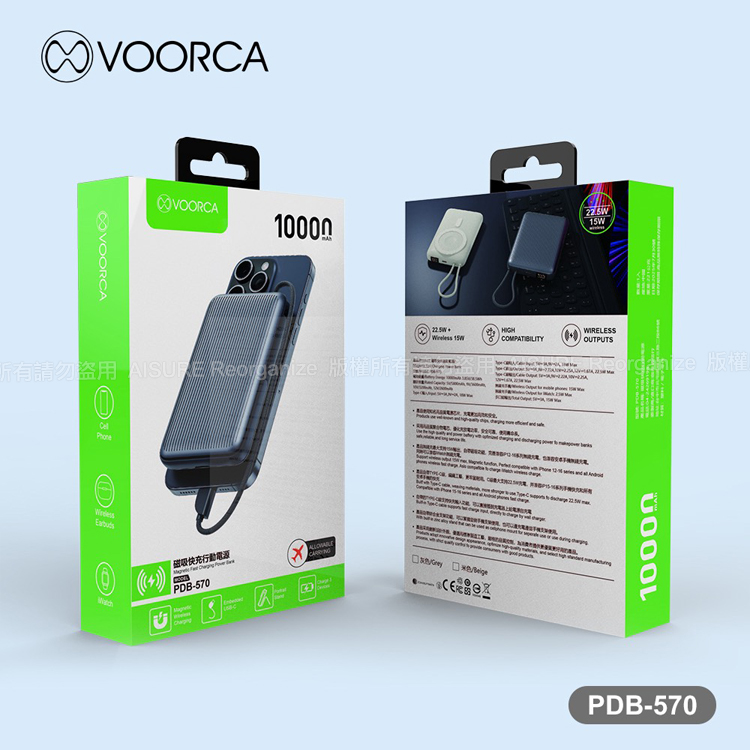 VOORCA PDB570 超薄行李箱10000mAh 自帶線+3合1磁吸無線充+立架功能 多功能快充-黑