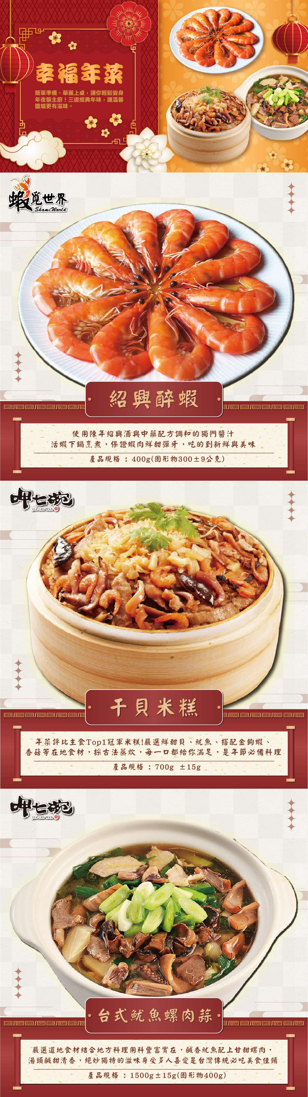 【呷七碗x吉晟嚴選】幸福年菜三道組E(魷魚螺肉蒜+干貝米糕+紹興醉鮮蝦)_2026年菜
