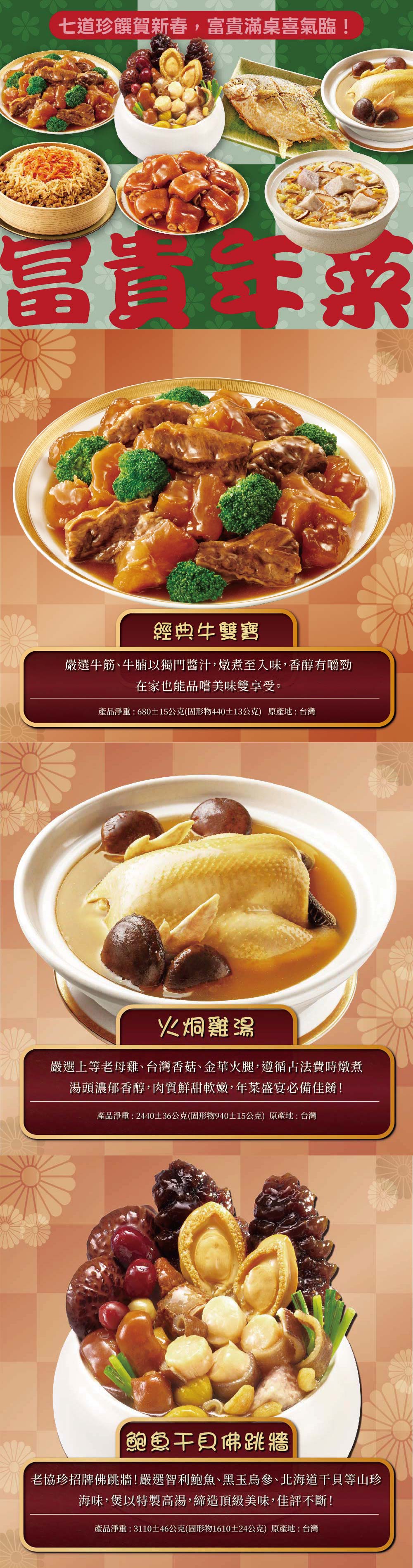 預購【老協珍】富貴年菜7件組A鮑魚干貝佛跳牆+火烔雞湯+經典牛雙寶+櫻花蝦干貝飯+冰糖豬腳+芋頭炊粉鍋+酥炸金鯧魚2026春節年菜2026/2/5~2/11出貨
