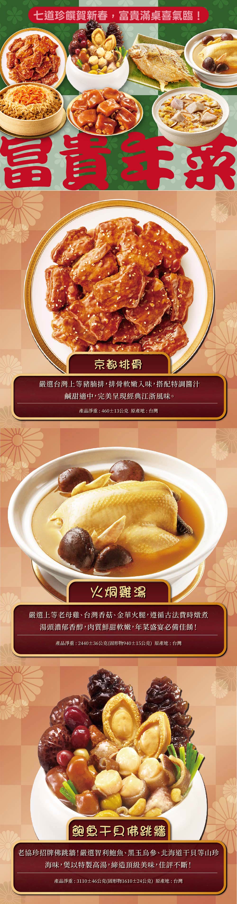 預購【老協珍】富貴年菜7件組B鮑魚干貝佛跳牆+火烔雞湯+京都排骨+櫻花蝦干貝飯+冰糖豬腳+芋頭炊粉鍋+酥炸金鯧魚_2026春節年菜2026/2/5~2/11出貨