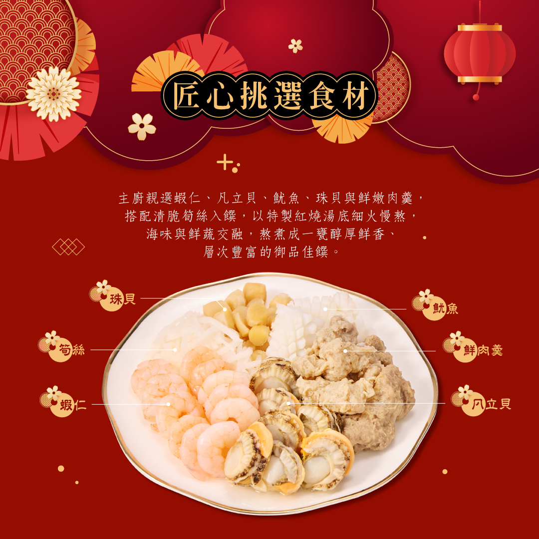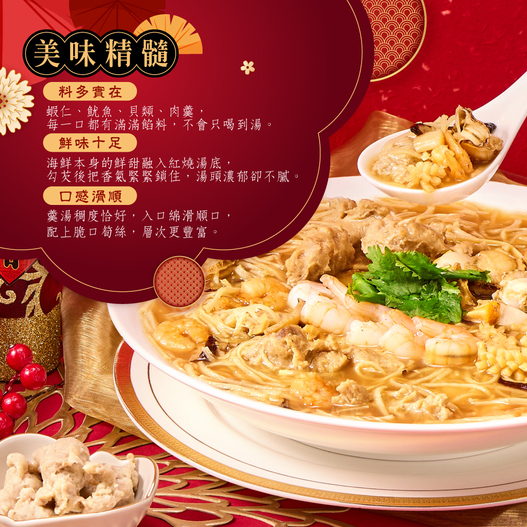 由主廚精選數種海鮮,搭配鮮嫩肉羹與清脆筍絲入饌,以特製紅燒湯底細火慢熬,海鮮本身的鮮甜融入其中,鮮香層層堆疊,羹湯濃稠滑順,講求料多實的羹湯,讓你每一口都能吃到餡料,是團圓桌上不可或缺的佳餚。