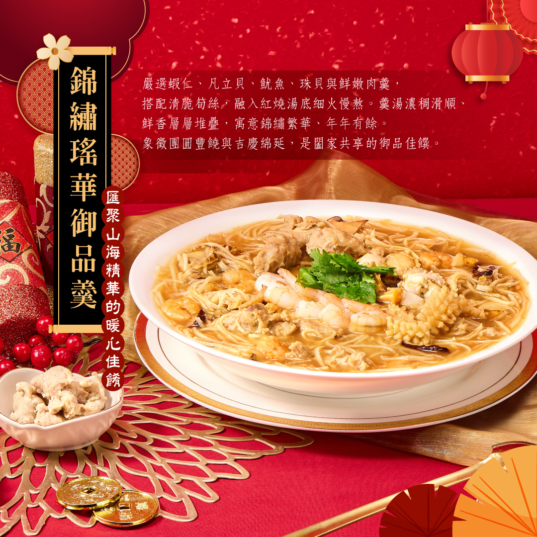 錦繡瑤華御品羹 — 寓意錦繡繁華、年年有餘;象徵團圓豐饒與吉慶綿延,是闔家共享的御品佳饌🧧
