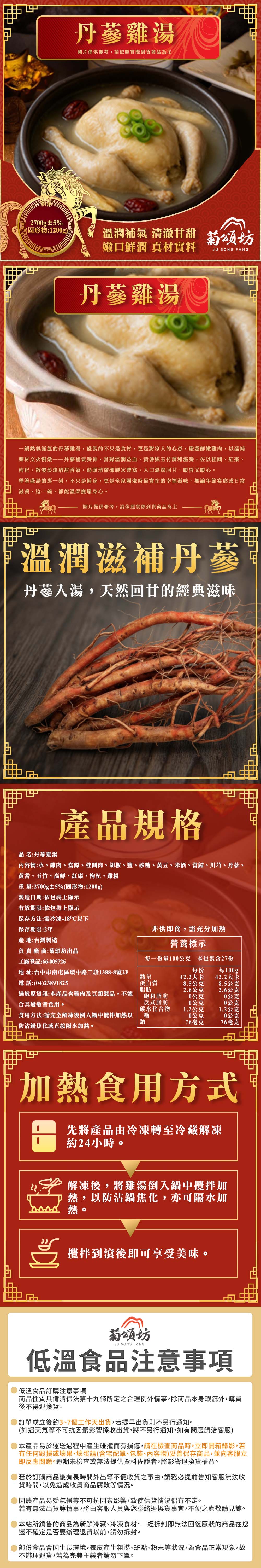 使用嚴選丹蔘與大骨慢火熬煮成金黃湯底,加入鮮嫩雞肉燉至入味,溫潤不燥、香氣濃郁。2800g 大容量一次滿足全家人的補氣暖身需求,年節餐桌、平日進補都