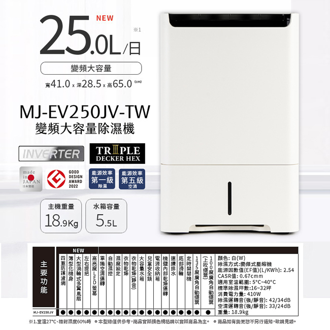 【MITSUBISHI三菱】25L變頻高效型清淨除濕機MJ-EV250JV-TW