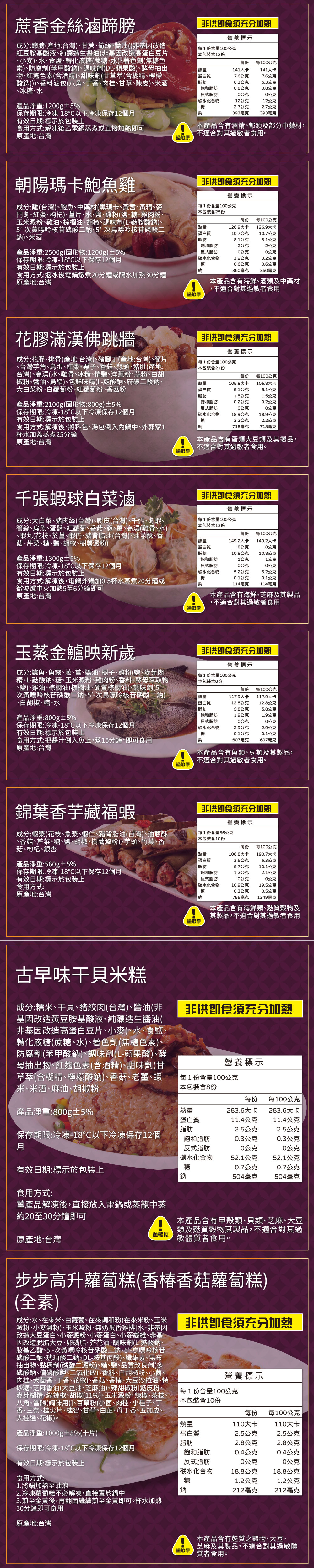 以八道經典台味佳肴一次滿足團圓餐桌。匯集滷香濃郁的金絲蹄膀、鮮芋包覆的藏福蝦、豐盛白菜滷搭配Q彈蝦球、豪華花膠佛跳牆與清蒸金鱸等海陸名品,再加上補氣暖身的瑪卡鮑魚雞、古早味干貝米糕,並貼心附贈步步高升蘿蔔糕。份量充足、風味道地,大人小孩都喜愛,是過節團聚最省心的一桌美味。