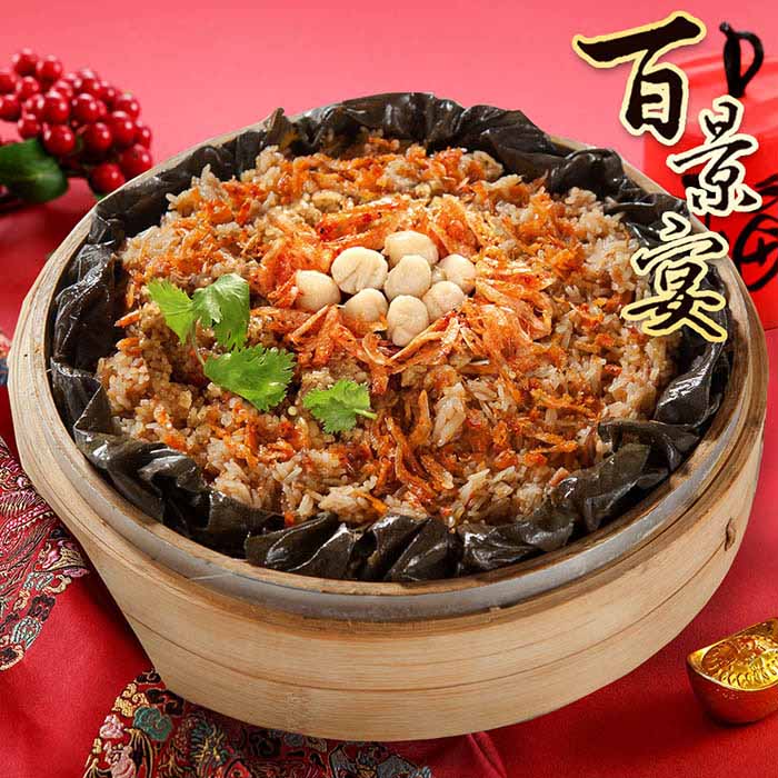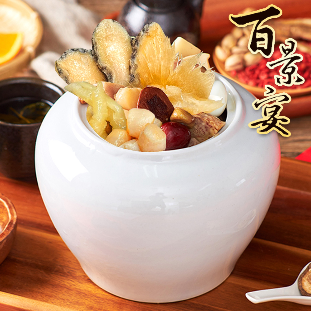 百景海宴佛跳牆:大骨高湯熬煮香氣撲鼻,滿滿海陸食材~豬腳蹄、大白菜、鮑魚、栗子、排骨酥、花膠...是過年團圓必備的經典年菜。