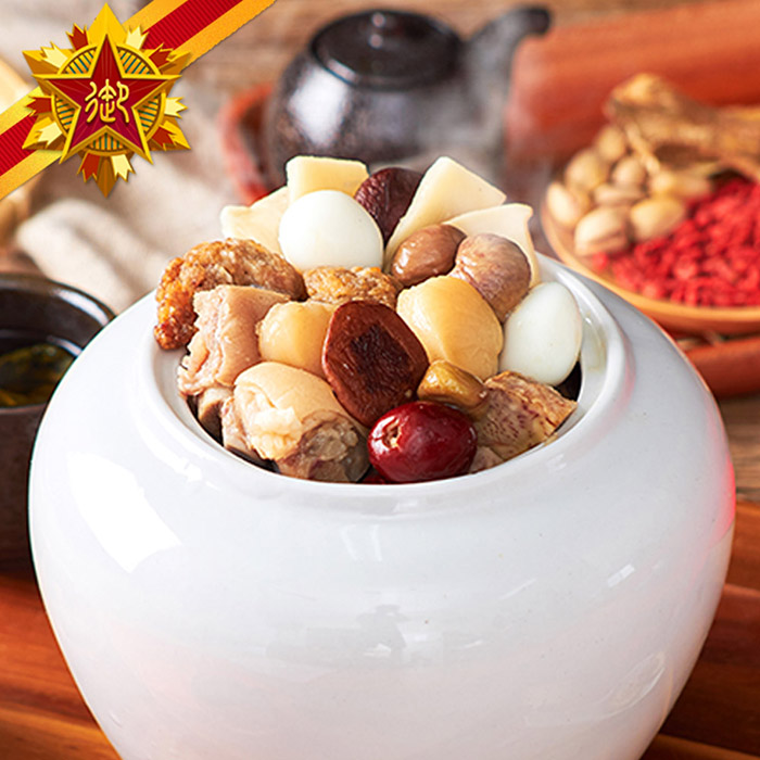 百景海宴極品松露佛跳牆:豬腳、排骨酥、栗子、貴妃鮑各項海陸食材,每項食材分開料理,是年節最費工費時的一道料理!