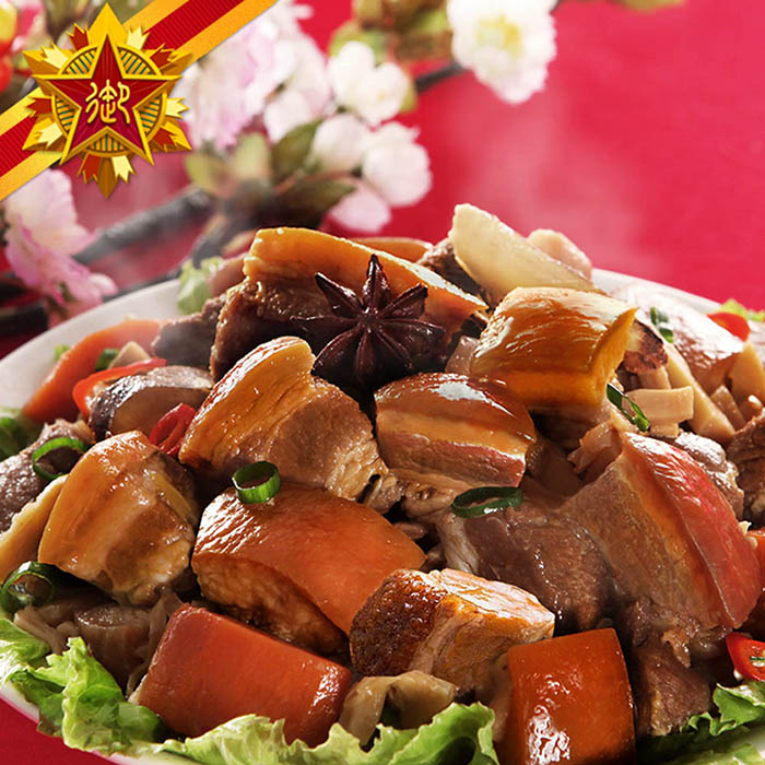 玉柱醬淋覓東坡:豐厚豬肉經過師傅獨家調製,皮嫩軟Q!搭配爽脆竹筍,團圓必備!