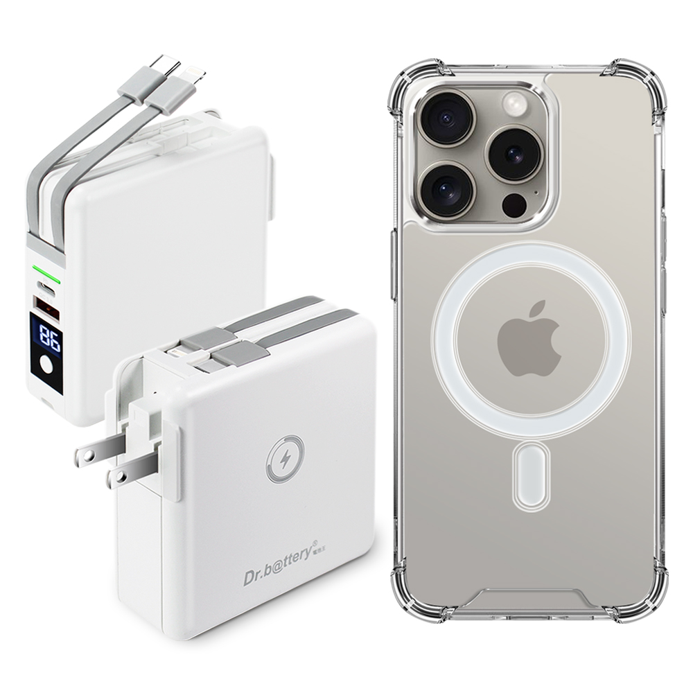 Dr.b@ttery電池王 多功能MagSafe無線充電+自帶線行動電源-白+贈 iPhone16 Pro 磁吸殼